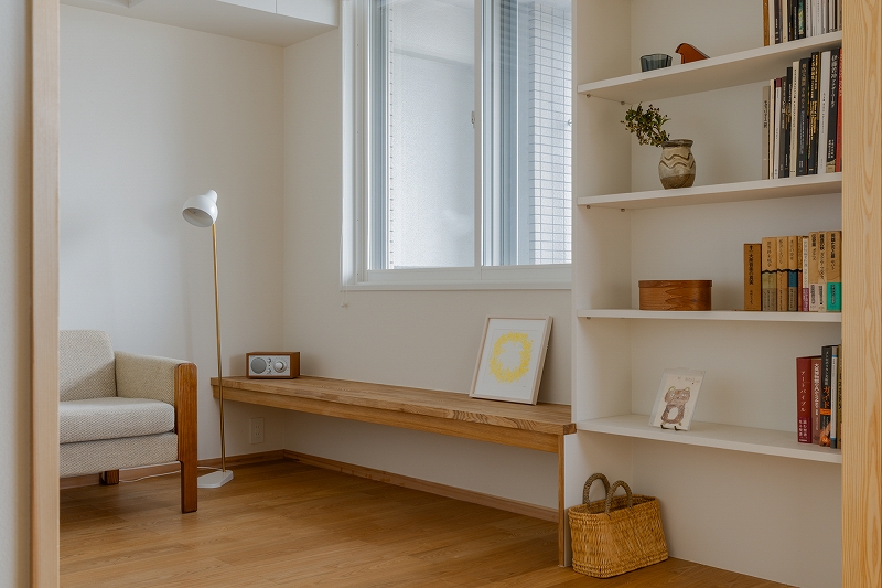 整えられた窓回りに併せて、ベンチやカウンターテーブルを設置することで
