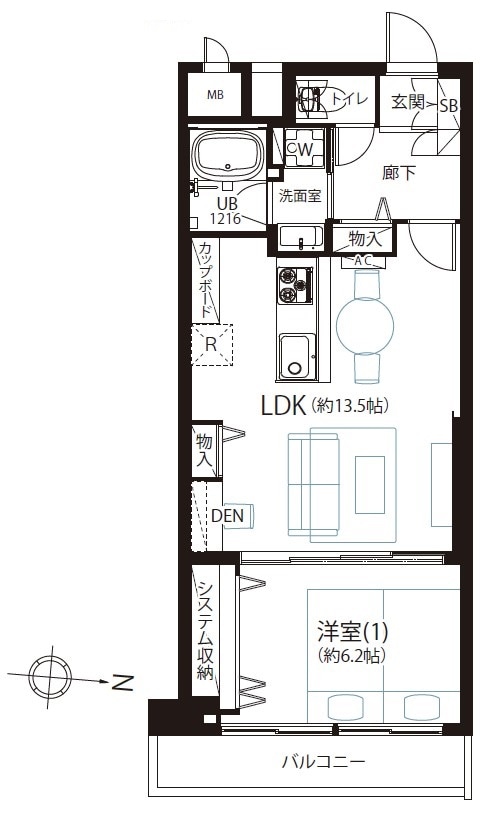専有面積は約48㎡。1LDKの間取りで、単身の方はもちろん、セカンドハウスとしても心地よくお使いいただけるサイズ感です。