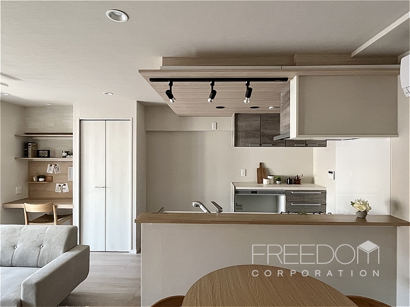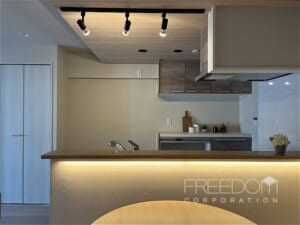 リビングとダイニングのゾーニングがしやすい空間設計で、照明も各所に配され、陰影のある雰囲気を楽しめます。