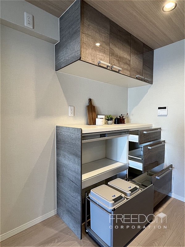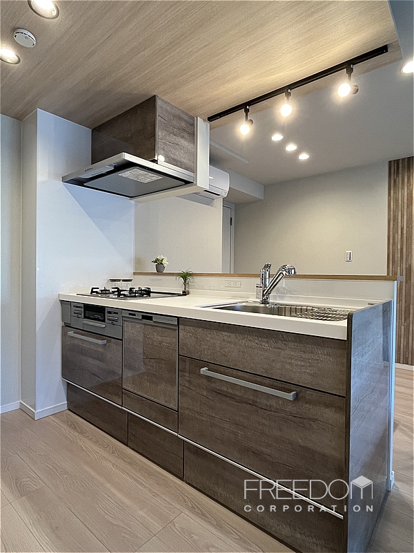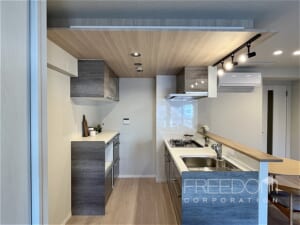 キッチンは開放感のあるペニンシュラタイプ。カップボードなどキッチンまわりの収納も充実しており、実用的で使いやすそうです。