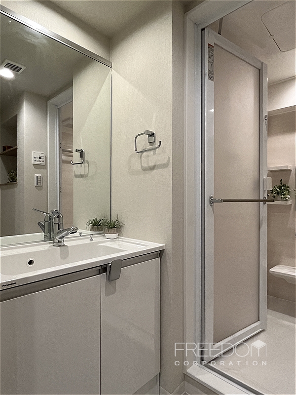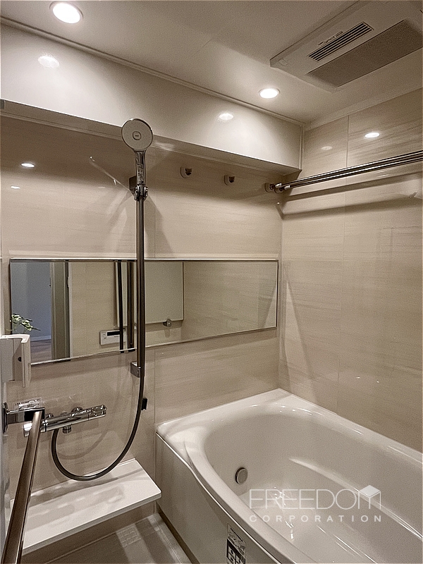 浴室、洗面室、トイレもリニューアル済み。浴室はややコンパクトな印象ですが、追焚き機能と浴室暖房換気乾燥機を備え、快適に使えそうです。