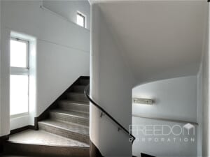 中:小窓を設けた階段室。柔らかな曲線やレトロなフォントも温かみがあります。