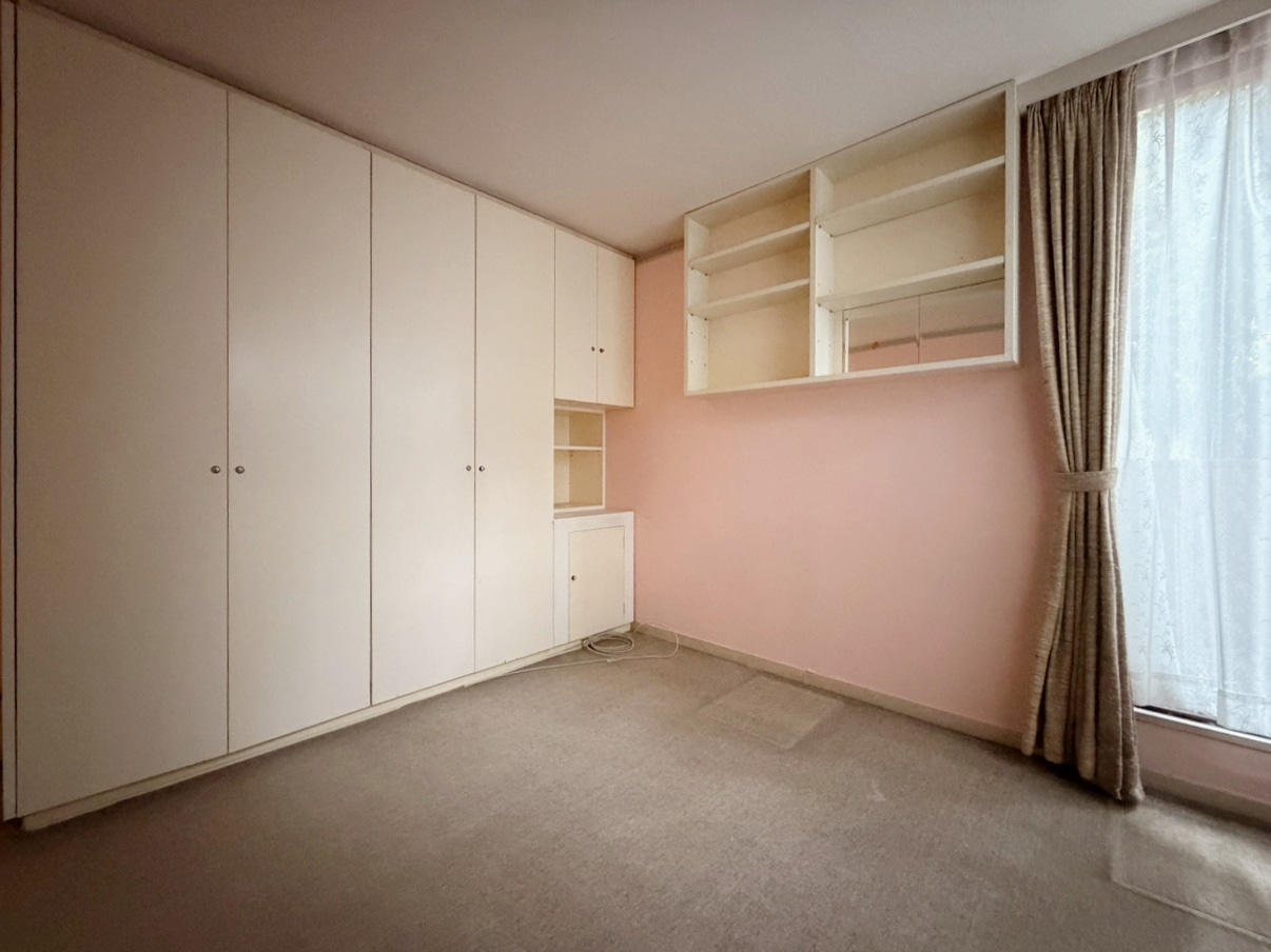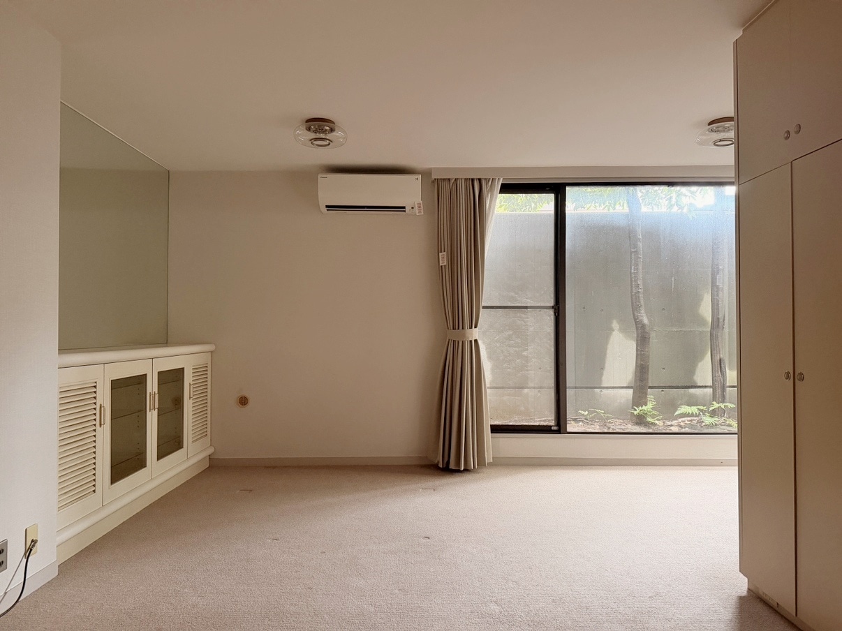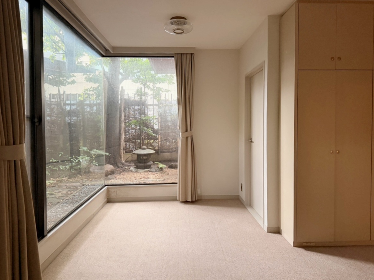 約7.5帖の洋室。こちらにもL型の大きな窓がございます。窓の先にはコンクリートの擁壁があるため、視線も気にならず安心感がありますね。