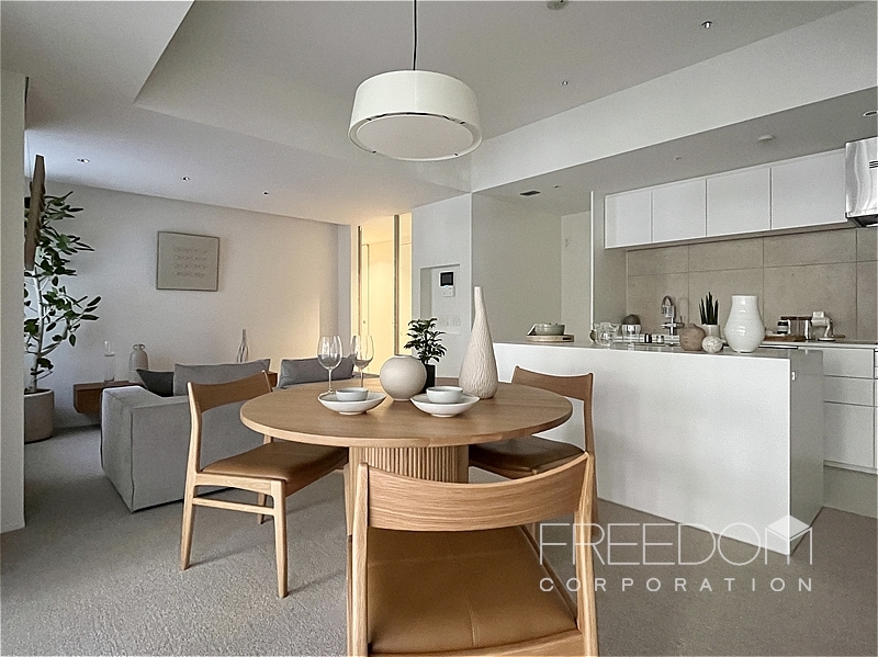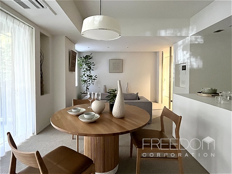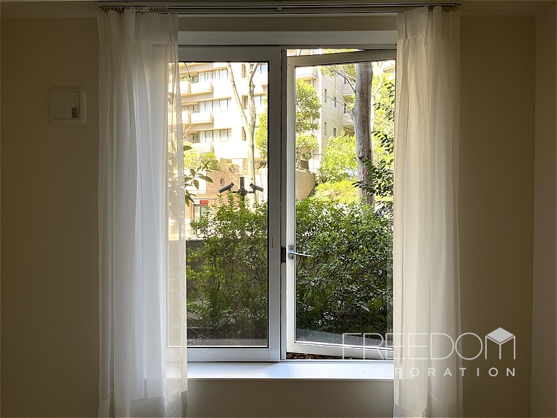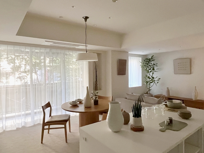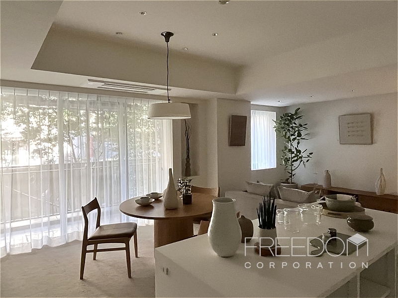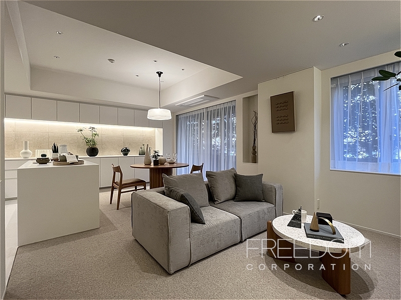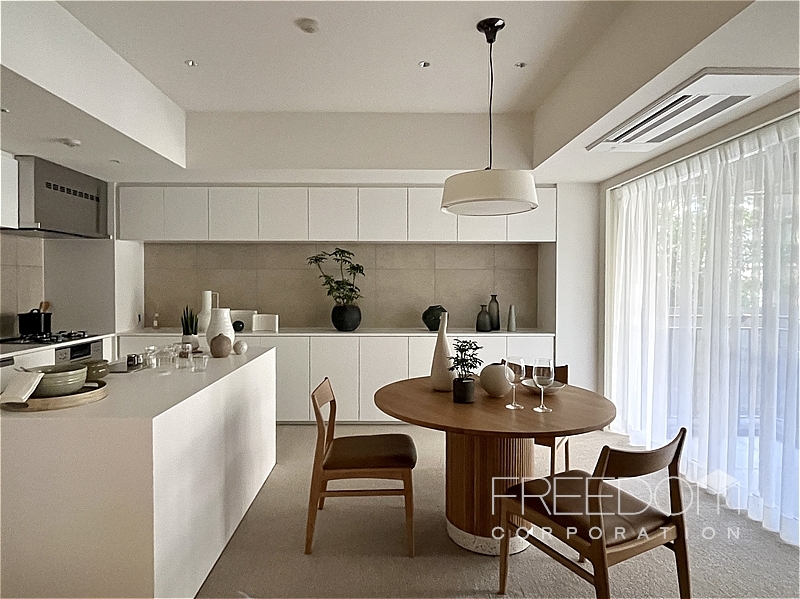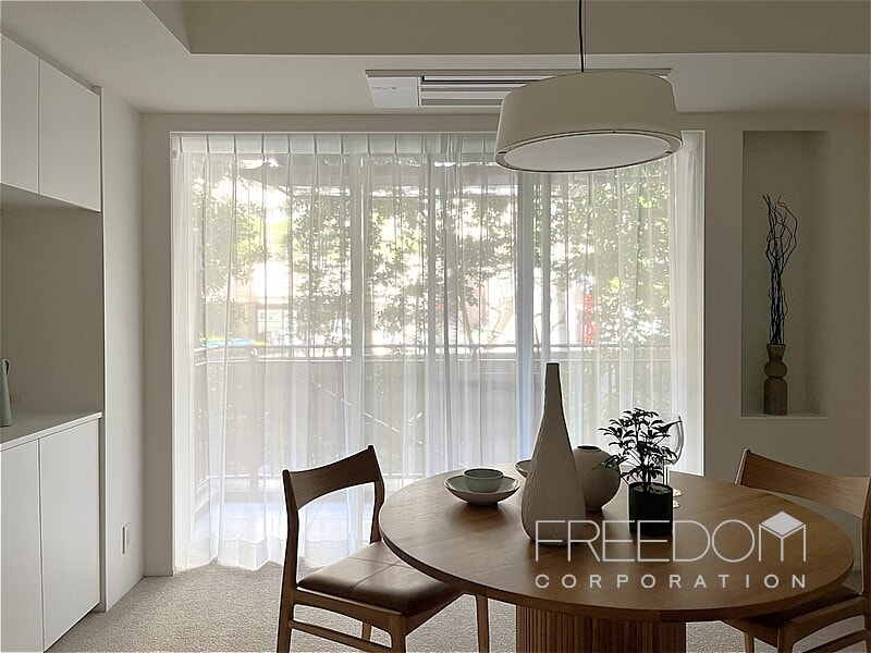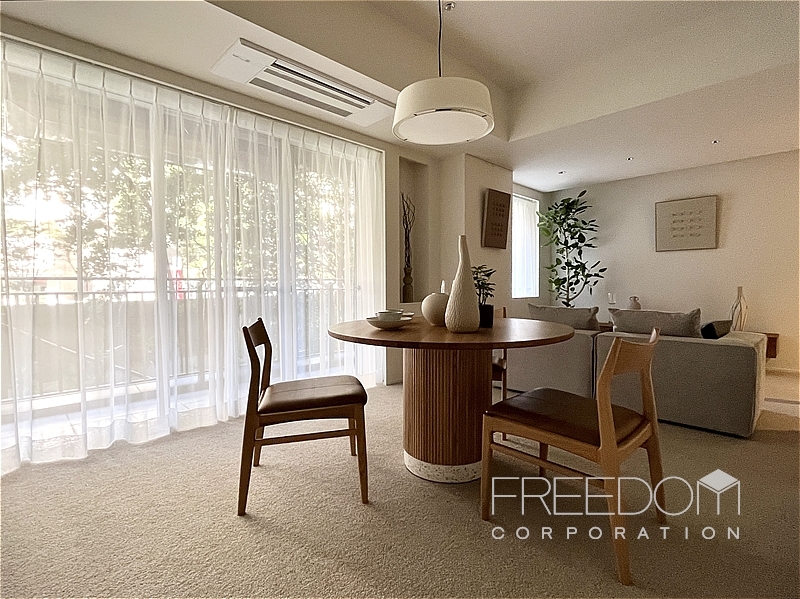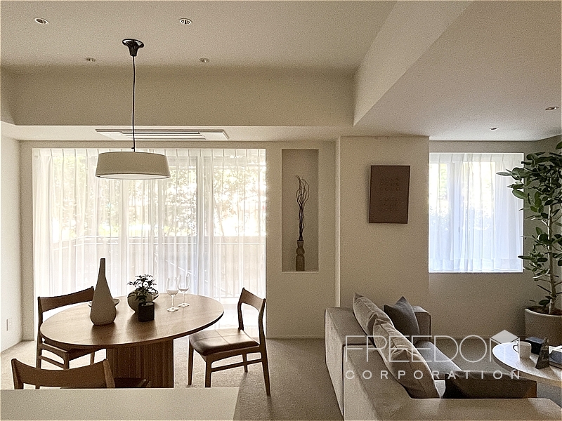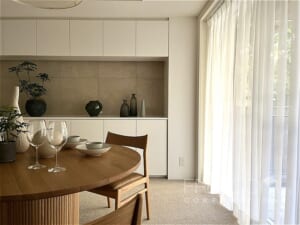 LDKは約20.5帖。大きな掃き出し窓と腰窓が並ぶ、ゆったりとした落ち着きのある空間です。北西向きのため日差しが入る時間は限られますが、窓辺には木立が映り、避暑地のような静けさが漂います。床は管理規約によりカーペット敷き。その柔らかな足ざわりも相まって、ホテルの一室ような気品が感じられます。