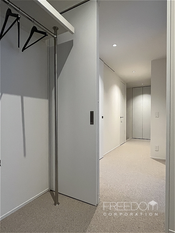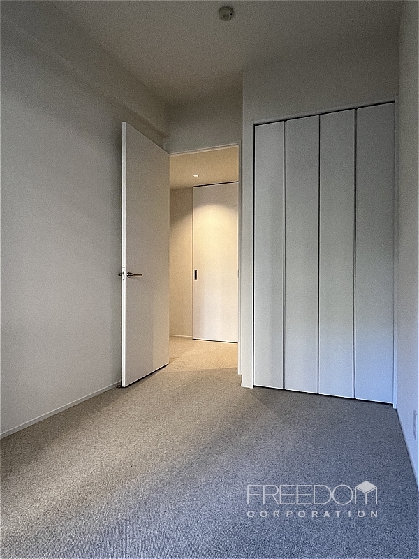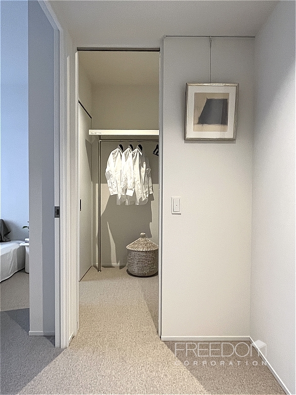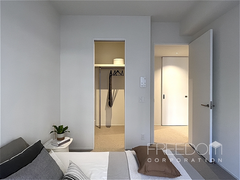洋室1は約6.5帖。大きめの腰窓から安定したやわらかな光が届きます。窓辺に映える木々の緑もやさしく、穏やかに過ごせるプライベートな空間です。ウォークインクローゼットは約2.2帖で、室内だけでなく廊下からも出入りできる2way仕様。収納力の高さはもちろん、暮らしの動線も考えられた造りです。