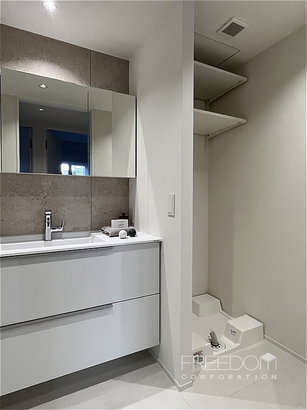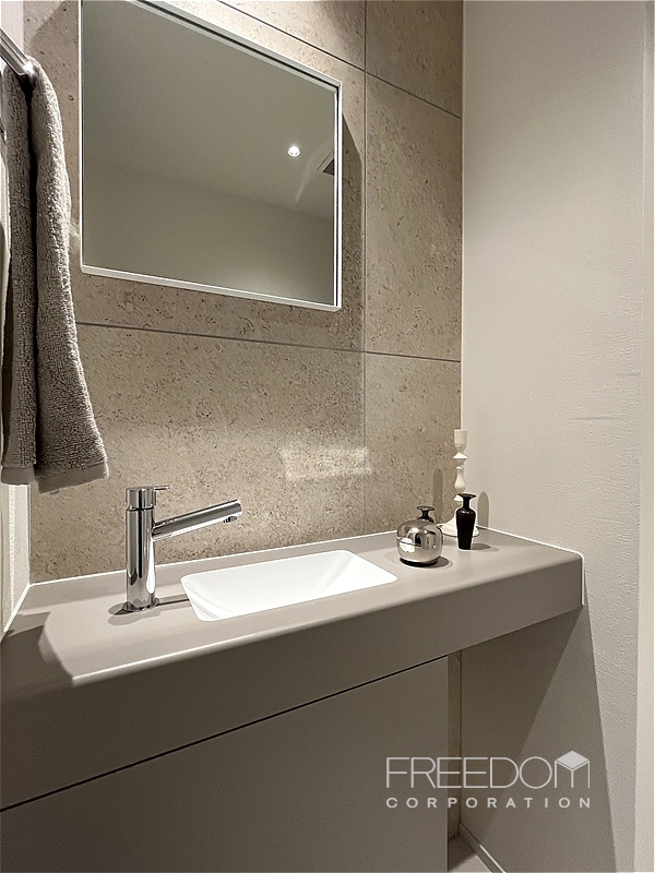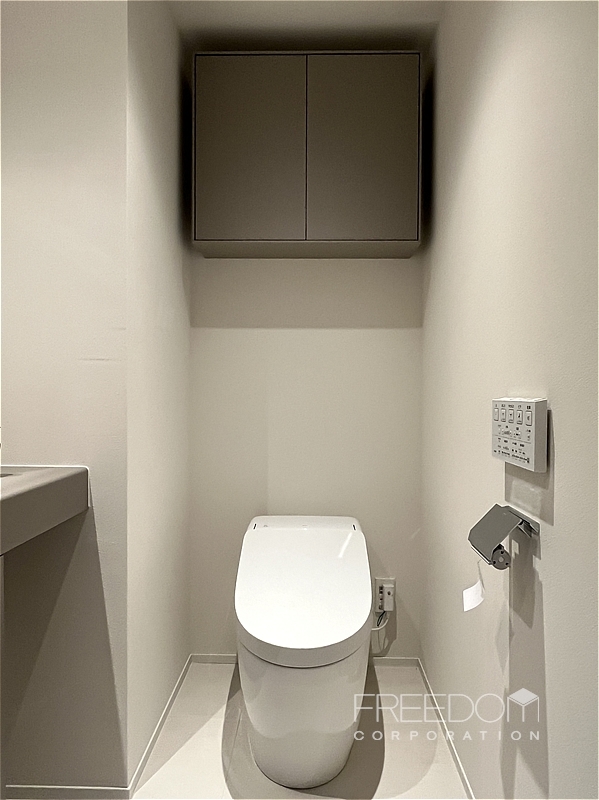 トイレは玄関近くにあり、外出前後や来客時にも使いやすい便利な配置です。手洗いカウンターなどにマットなグレージュがあしらわれ、モダンで品のよい空間に仕上がっています。