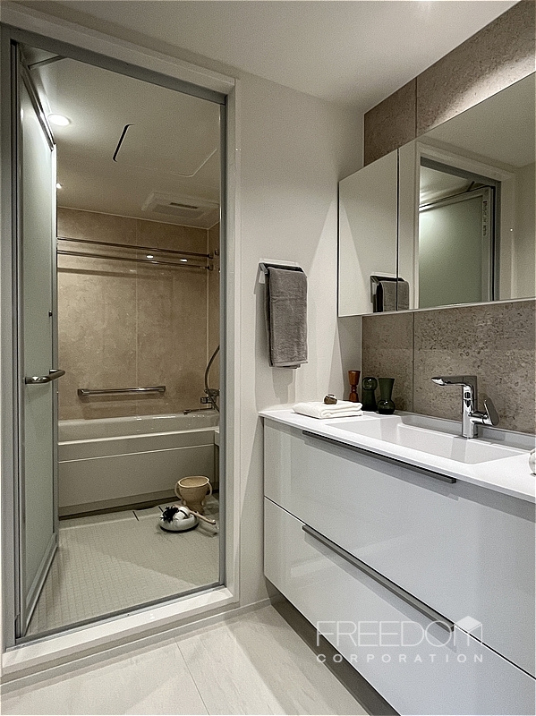 水まわりは廊下に沿って並びます。洗面室と浴室は寝室から近く、日々の身支度や入浴の際も効率的な動線です。浴室はゆったりとした1418サイズを確保し、洗濯機置き場は水とお湯の2つの水栓を備えるなど、暮らしへの配慮が行き届いた設備・仕様です。