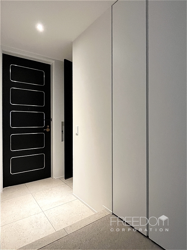 玄関周りも収納が充実。廊下には奥行きのあるクローゼットが収まりよく設置され、シューズインクローゼットの扉には姿見を兼ねたモダンなデザインが採用されています。