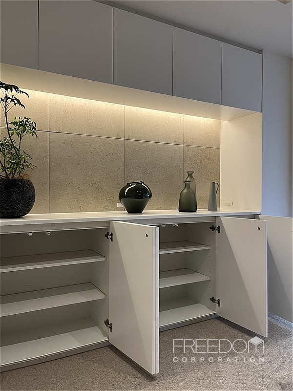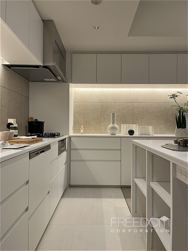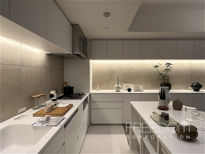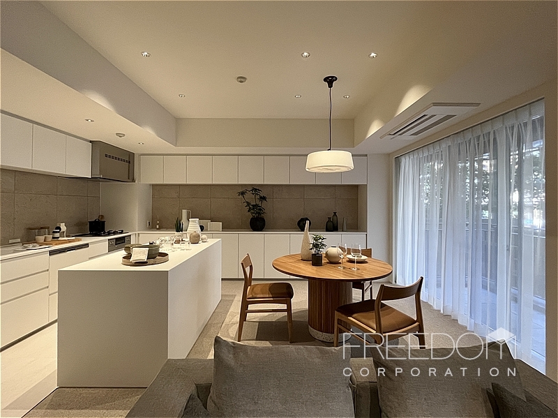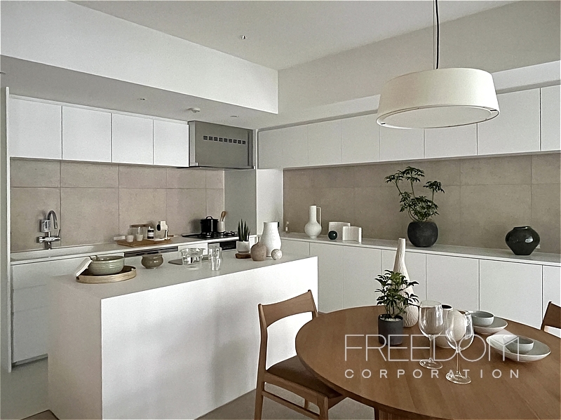 キッチンは空間に美しく馴染む壁付けのオーダーキッチン。ゆとりある広さのカウンターが備わっており、調理や配膳のスペースも十分に確保されています。壁面のカウンター収納はダイニングまでひと続きのデザインで、どちらからも使いやすい大容量。全体的に色味を抑えたマットな質感で、実用的かつ端正な設えです。