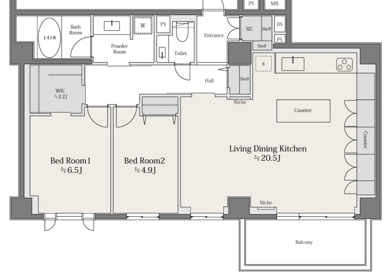 専有面積は約79㎡。一つひとつの空間にゆとりを感じさせる2LDKの間取りです。