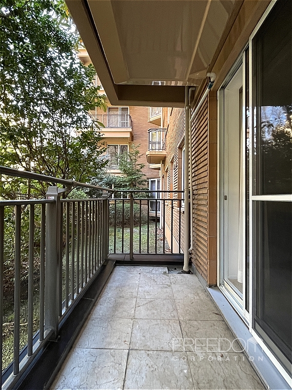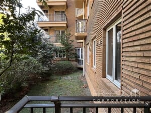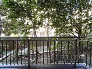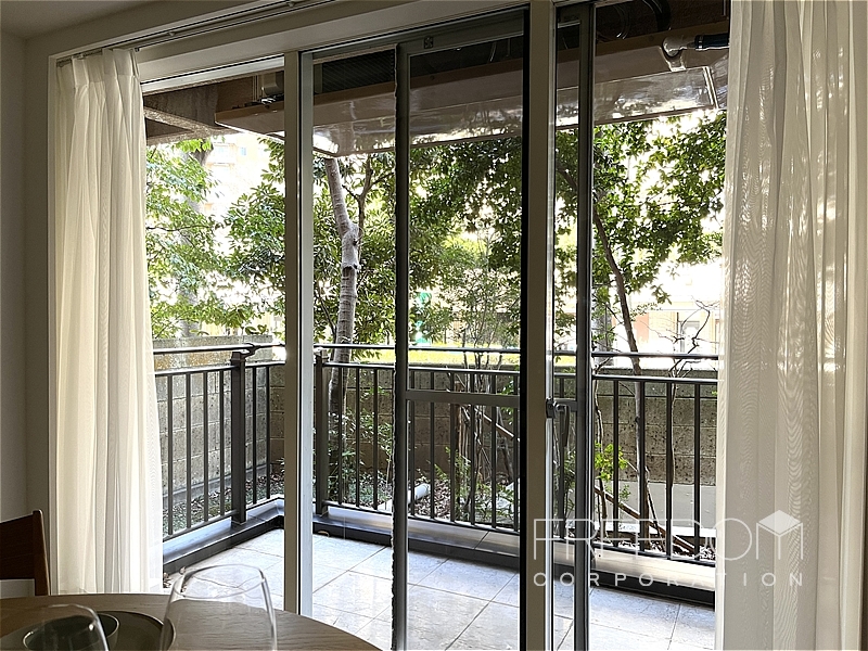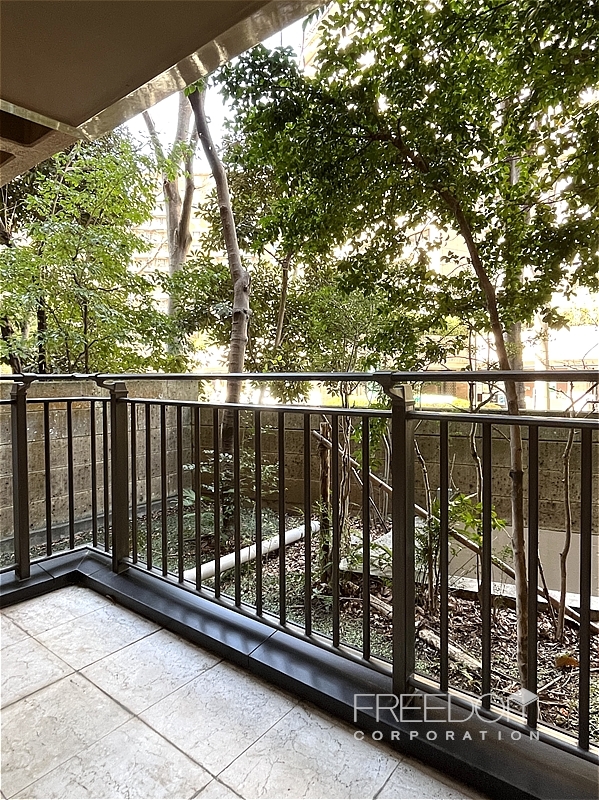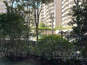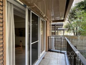 バルコニーもゆとりある広さです。美観への配慮から、室外機が頭上に設置されている点も広尾ガーデンヒルズらしい造り。1階ですが、木々がほどよく視線を遮ってくれるため、落ち着いた環境が保たれています。冬の時期でも常緑樹の緑を望めますが、新緑の季節には、いっそう爽やかな風景を眺められそうです。